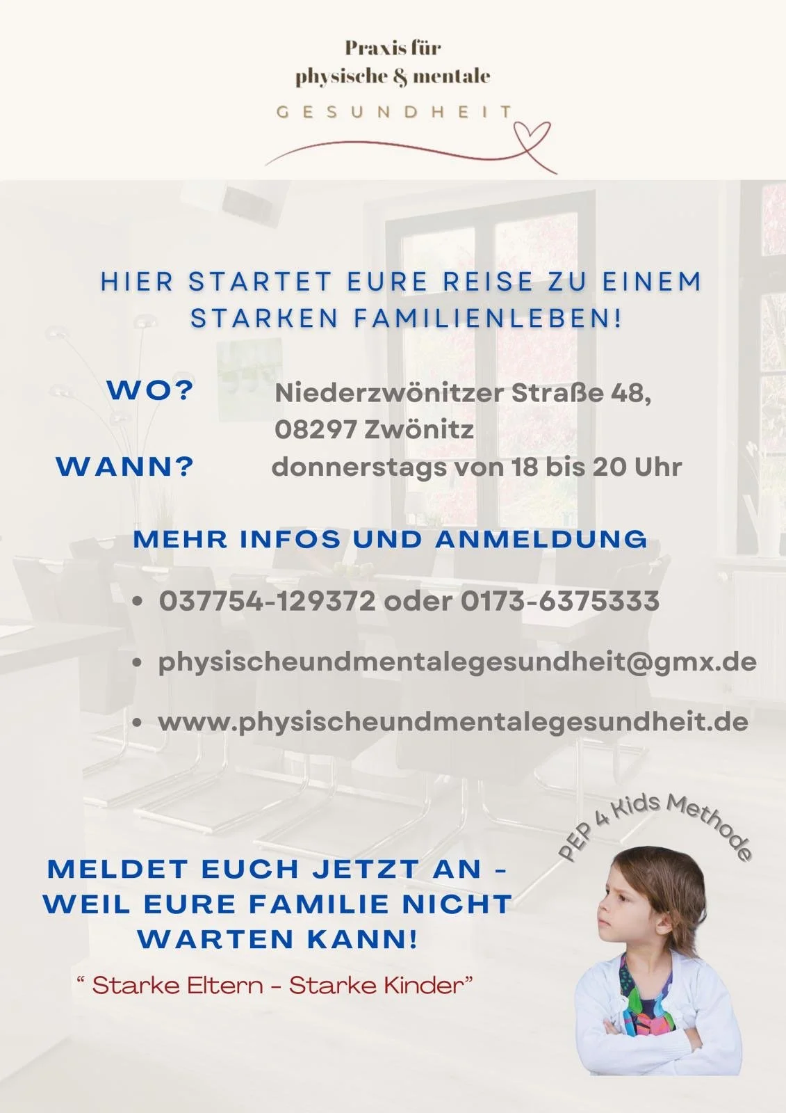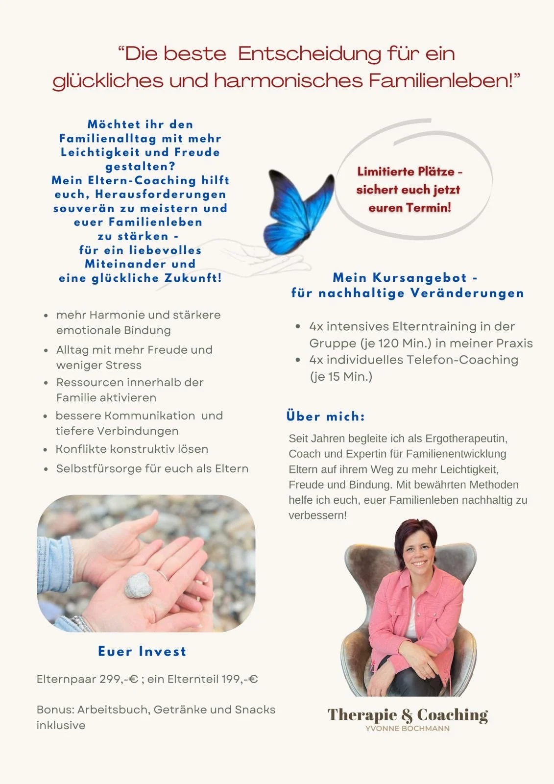 Mein Herzensprojekt startet bald. Ich freue mich Eltern zu unterstützen, um Ihnen einen Mehrwert für einen harmonischen Familienalltag bieten zu können! Die Eltern-Kind-Bindung sowie Erziehungsstrategien sollen bei dem Coaching in der Gruppe besonders im Fokus stehen.